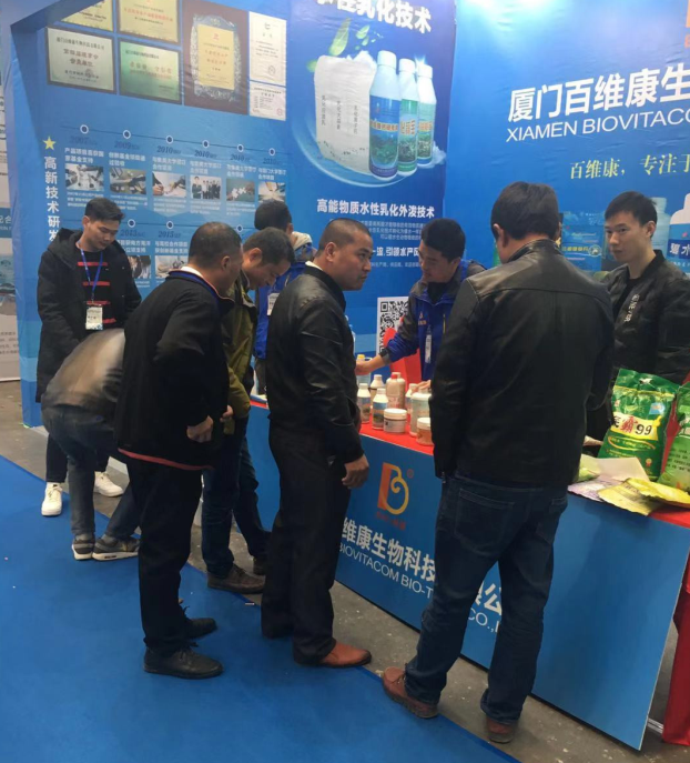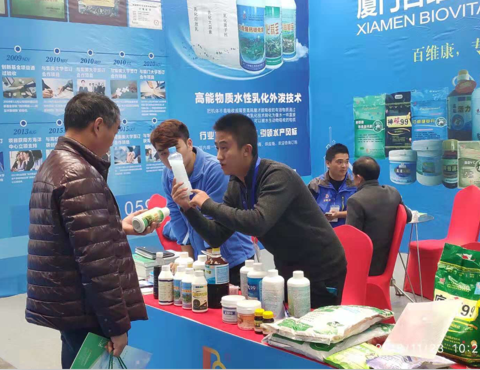 廈門百維康洞悉目前國內(nèi)水產(chǎn)行業(yè)市場現(xiàn)狀,公司高技術(shù)創(chuàng)新團(tuán)隊在國內(nèi)水產(chǎn)行業(yè)最早研發(fā)“水性乳化技術(shù)”這一水產(chǎn)用品新劑型,把水生動物不易吸收或需要高耗能才能吸收的高能營養(yǎng)物質(zhì)通過水性乳化技術(shù)轉(zhuǎn)化為像水一樣直接可以被動物吸收的物質(zhì),在極大程度上提高有效物質(zhì)吸收率,節(jié)省的生物耗能用來生長,并最早、最廣在肥水劑、免疫增強(qiáng)劑、補(bǔ)鈣硬殼等方面應(yīng)用這一劑型,填補(bǔ)了國內(nèi)市場這一空白領(lǐng)域,得到了參展者的強(qiáng)烈興趣和廣泛關(guān)注。